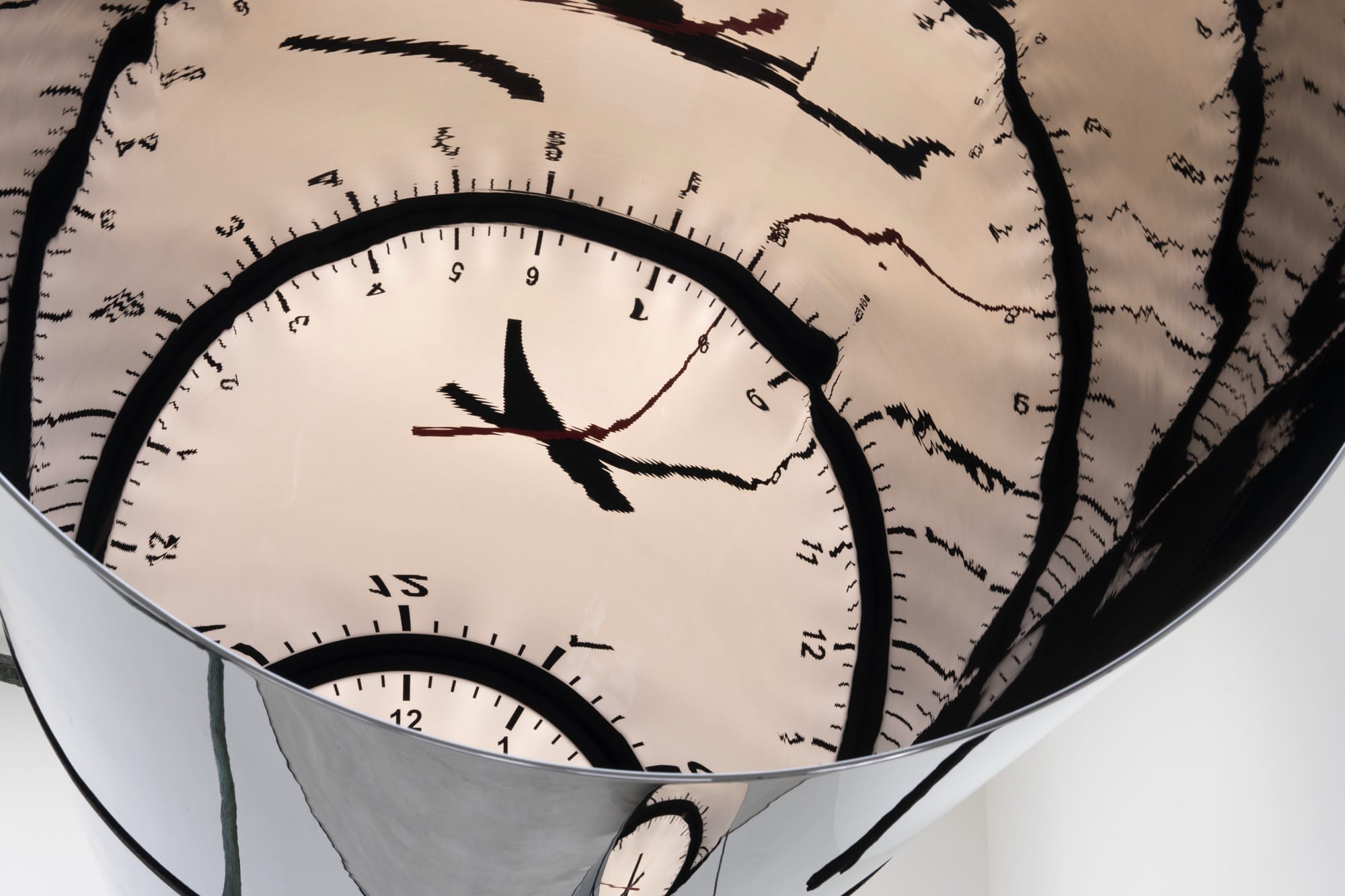 Mirrored cylinders hang among the structures with distorted clock faces on their ends. Warping further as viewers move around the forms, these timepieces reflect the ways we are all bound up with the passing of the days. Time, Kwade suggests, skews our perceptions and realities and is only partially in our control. Whereas the city conforms to human design, nature doesn’t, and neither wholly does time.