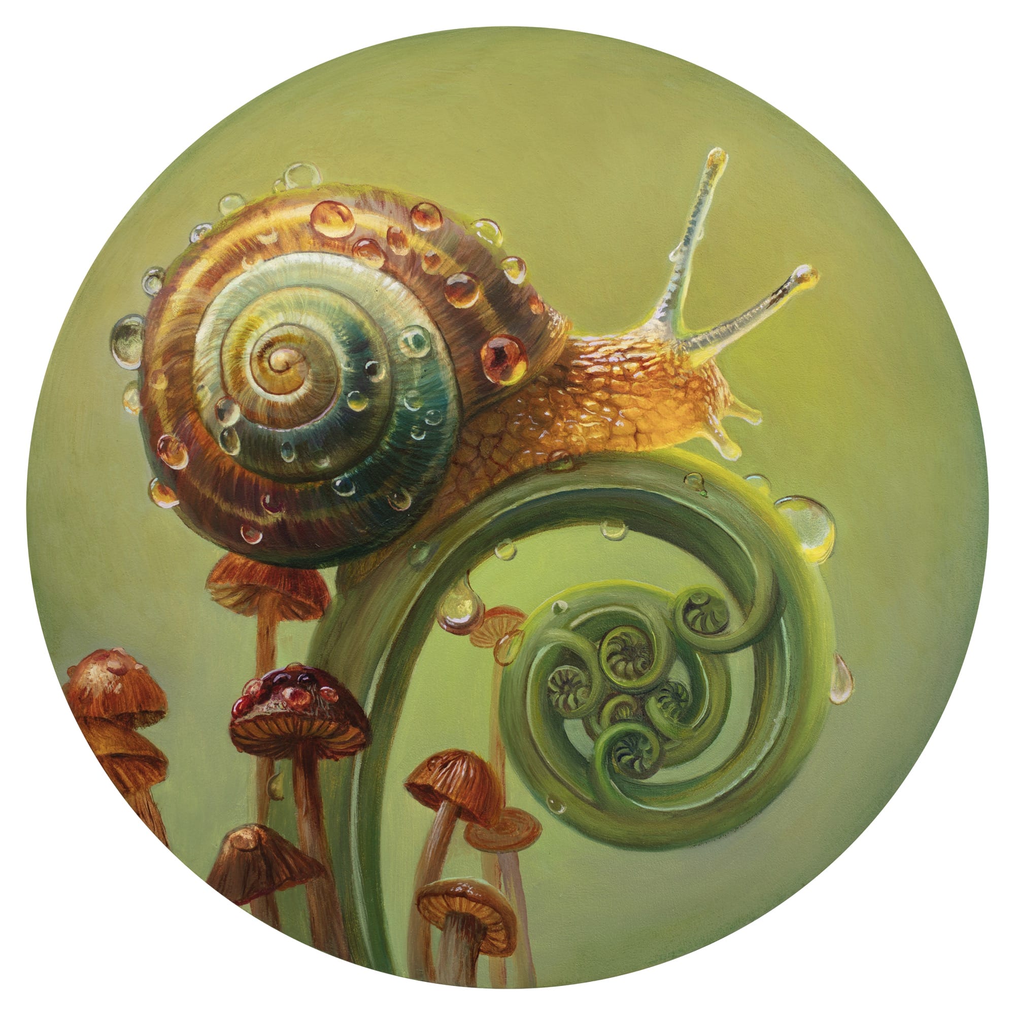 “Parallelism 4 (Snail),” oil on wood, 18 inches diameter